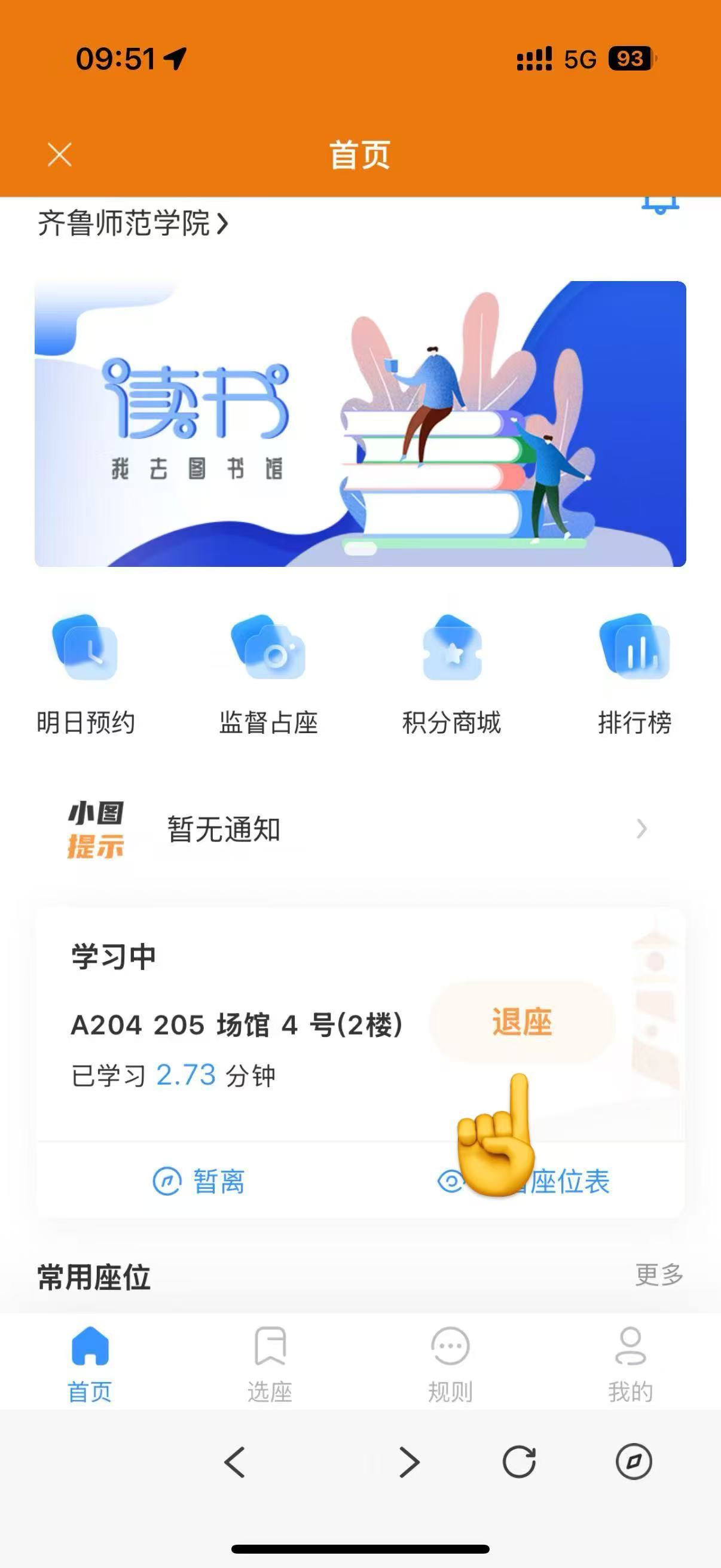 1.预约选座后可退座,退座后1分钟内不可选座,不能在规定时间内到馆签到、未主动退座的,记违规1次;