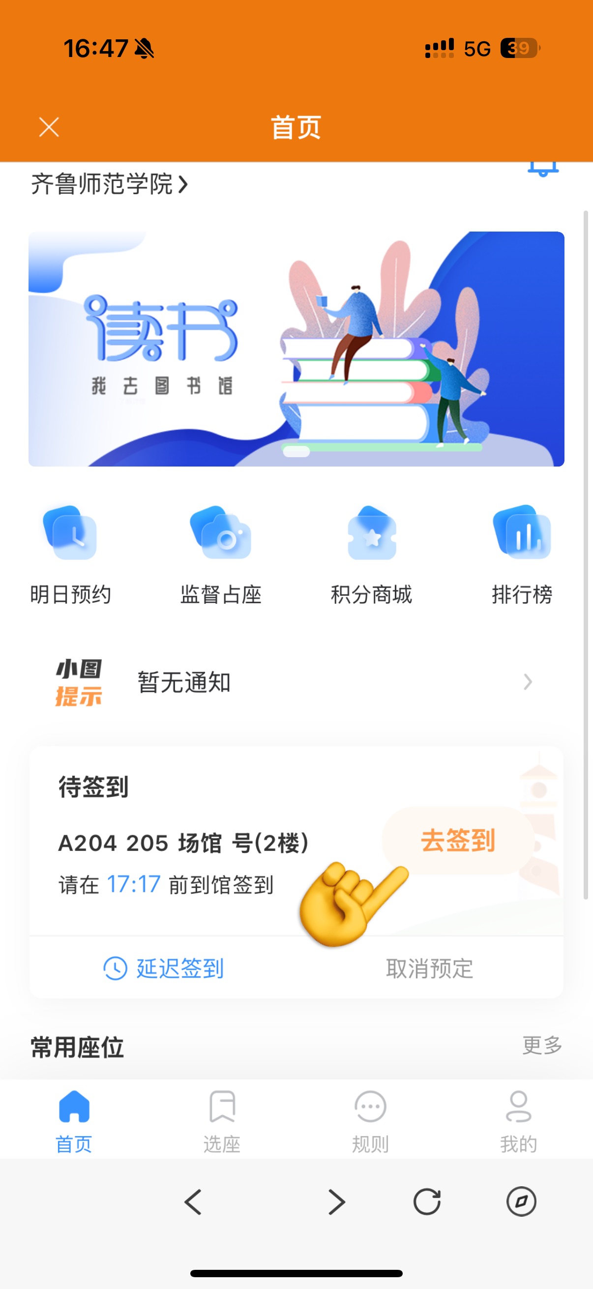 (3)若未按规定时间到馆签到,所选座位释放进选座系统供其他同学预约。