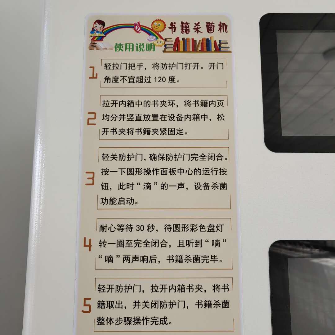 书籍杀菌机操作十分简便,只需将图书展开放置在内箱支架上,并用书夹夹紧,轻关防护门,按下开始按钮,杀菌机就开始对书本进行逐页杀菌,整个过程只需30秒,每次可以同时消毒六本书。读者自助操作,实现健康阅读。