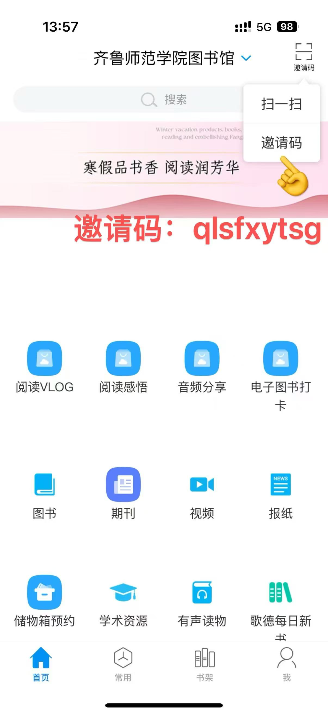 2.打开超星移动图书馆,点击右上角邀请码,输入qlsfxytsg。