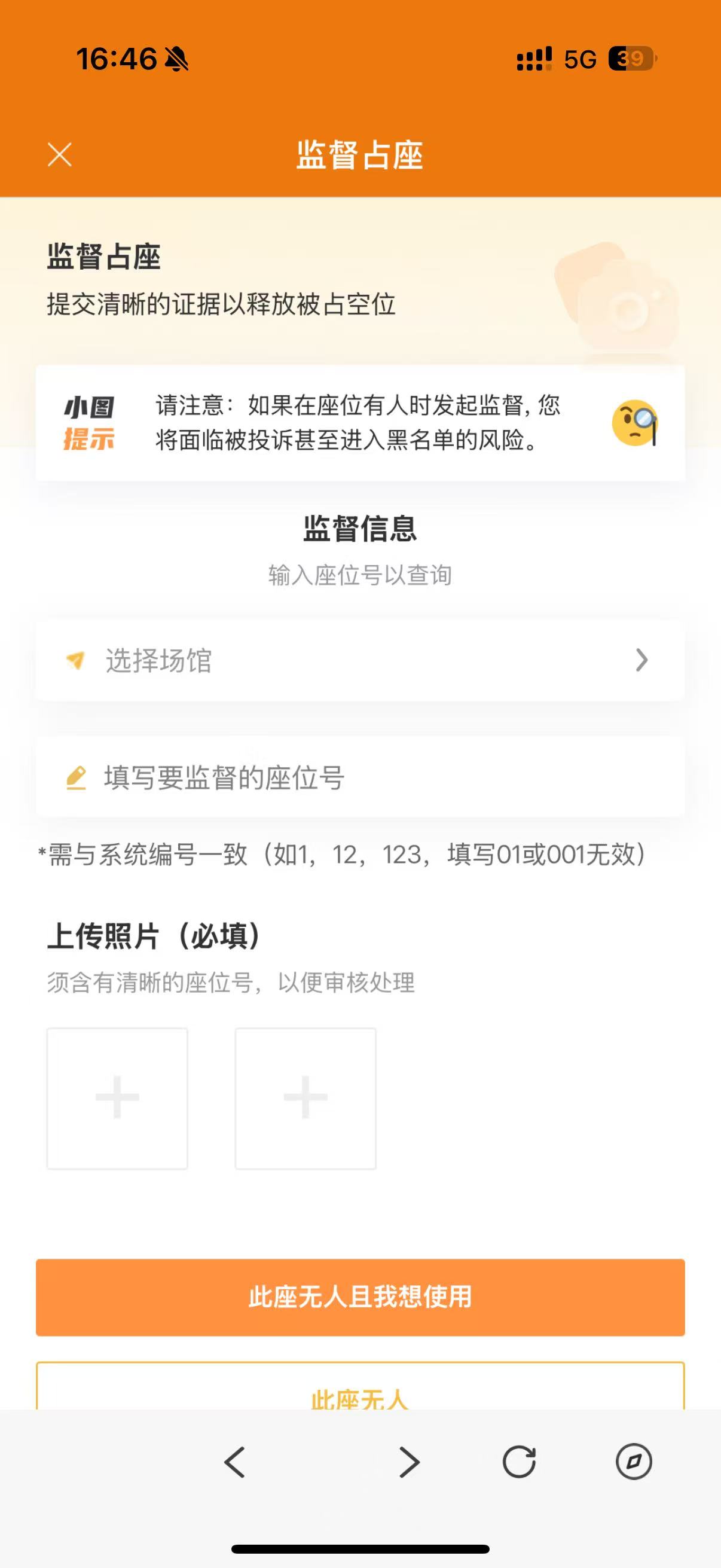 读者发现某个座位在系统内显示有人但实际无人,即可使用“监督占座”功能,需要拍照上传留证。被监督的读者会收到一条手机信息,提示“已被监督”,需在10分钟内到机器前扫码,否则视为离馆未退座/占座记违规1次,座位会自动转给监督者,变更为预约完成状态,监督者进行扫码确认就座。