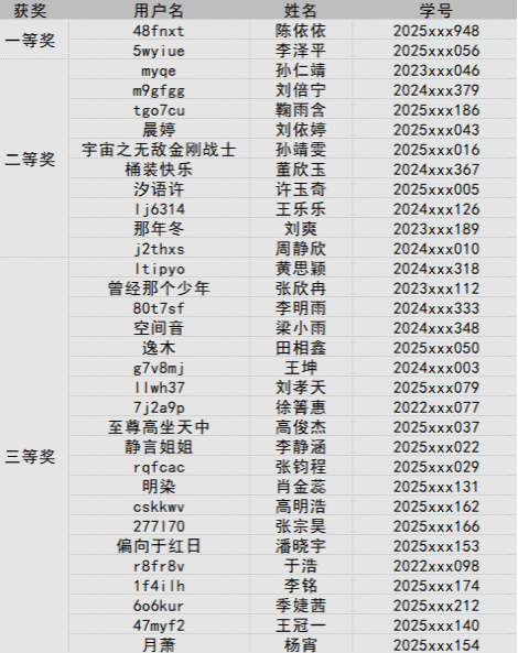 本次思维混战赛突破传统知识竞赛模式,题目设计巧妙,融合多学科基础、逻辑推理与时事洞察,着重考察参赛者的快速反应、知识关联与逻辑思维能力。经过系统自动判分与严格的成绩复核,依据竞赛规则,共有32名同学凭借其出色的表现荣获奖项。