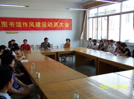 随后,马馆长对图书馆进一步加强作风建设的工作进行动员。马馆长指出,抓好馆风建设,全面提升人员素质,锤炼一只能打硬仗的队伍是学院形势发展的需要,是图书馆适应新馆建设、转制迎评、向现代化数字化高校图书馆迈进所必须进行的基础性工作。明年新馆建成后,我院图书馆硬件环境将进入省内高校图书馆前列,但由于历史和现实的种种原因,我馆人员的整体素质、工作能力、服务意识、人文修养水平,离建设现代化图书馆的要求还有很
