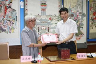 张福建副院长首先代表学院向梁光绪先生颁发了“图书馆客座研究馆员”的聘任证书,并宣布将梁先生的“光绪画廊”确定为美术学院的教学实习基地,梁先生则向学院赠送了他精心绘制的扑灰年画。