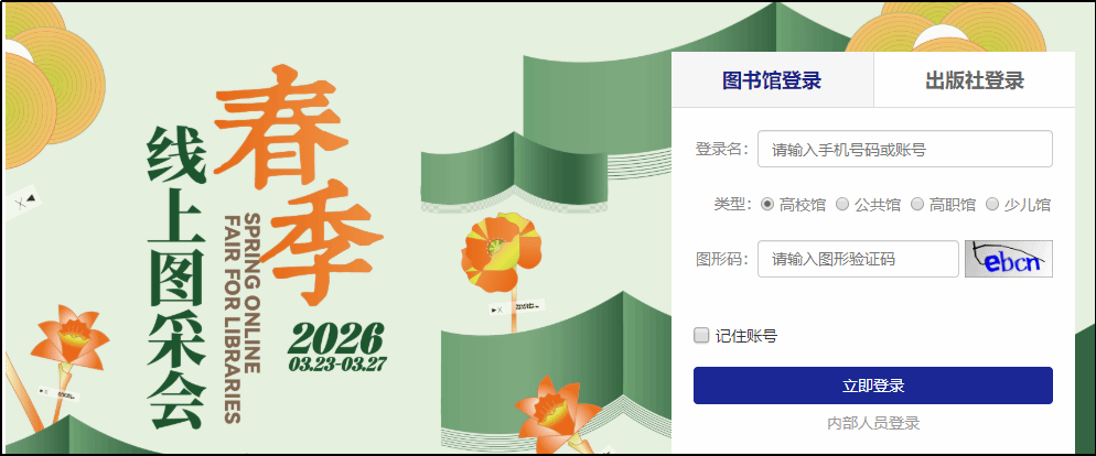 选择【图书馆登录】→输入【用户名】→选择单位属性【高校馆、公共馆、高职馆、少儿馆】→输入【图形码】登录。