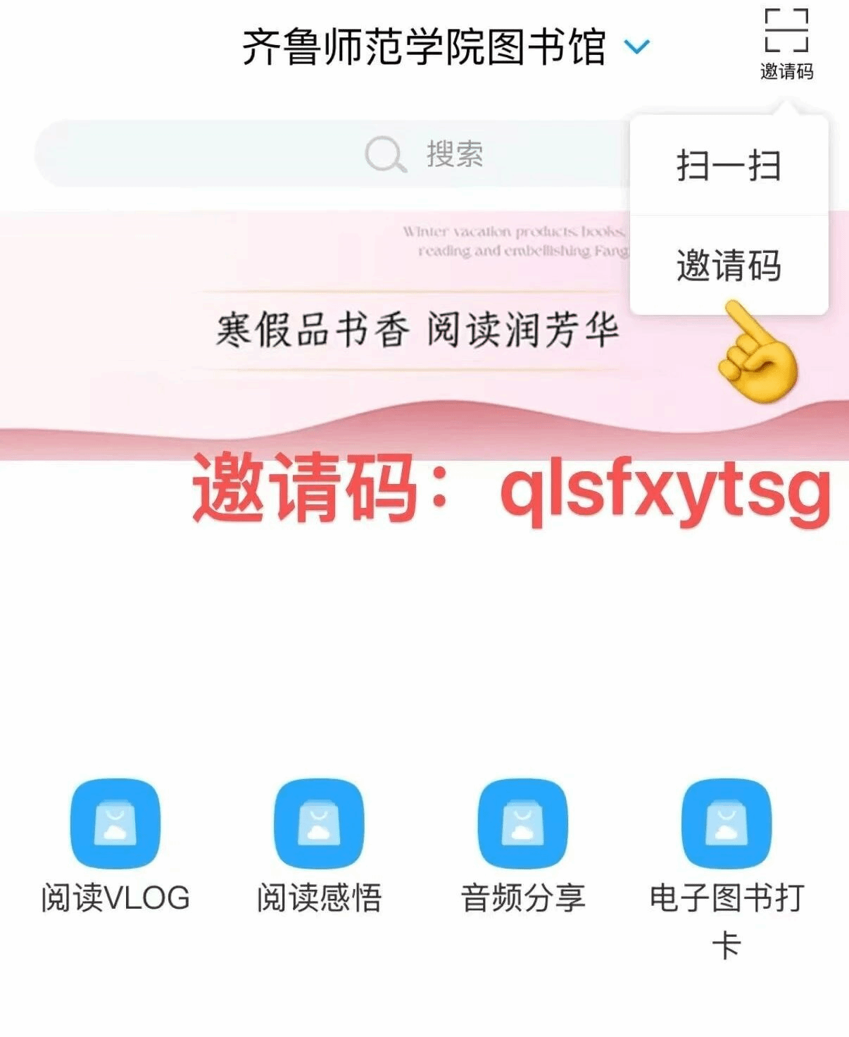 2.打开超星移动图书馆,点击右上角邀请码,输入qlsfxytsg。
