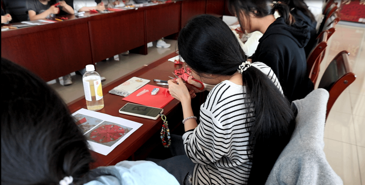 在实践环节,学生们纷纷拿起剪刀尝试创作。从最简单的窗花,到融入校园元素的创意作品,在剪刀开合间感受传统技艺的精妙,将一张张普通红纸化为了一个个精美作品,现场欢声笑语不断。一位参与活动的同学表示:“原以为剪纸离我们很远,今天才知道它就在身边。每一次指尖的转动,都是对传统文化的触摸。”